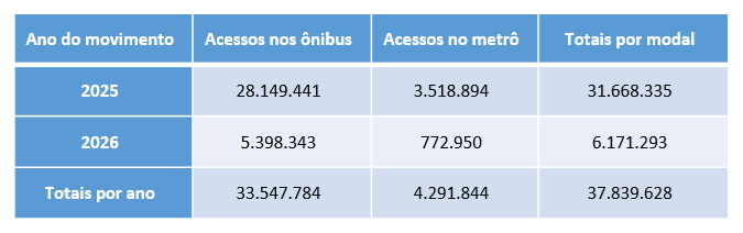 Em 2025, o programa registrou 31,6 milhões de acessos. Nos dois primeiros meses deste ano, os ônibus e metrô do DF receberam mais de 6,1 milhões de embarques. E no último domingo (1°), o movimento foi de 456.773 acessos, totalizando 38.249.926 viagens de graça para a população. Incluído nesse total, o metrô recebeu 4,2 milhões de acessos, sendo 3.518.894 embarques em 2025 e 772.950, em 2026.